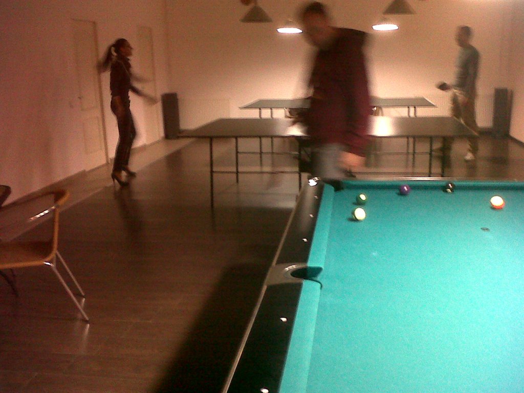 Ne-am apucat de-un biliard – şi pe la jumătatea primei partide au aparut un nene şi o tanti, well dressed and all care, evident, ne-au adresat clasica întrebare: “mai aveţi mult?” la care au primit clasicul răspuns “abia am început”; therefore – au ales altă distracţie, recte “umpic” de ping-pong.